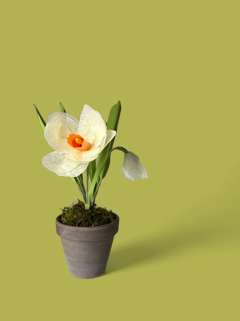Welcome Spring year round with a handcrafted paper daffodil in a mini pot. This harbinger of spring celebrates the bright greens, yellows, whites and oranges of new life and hope. Each daffodil, bud and green leaves are made to order and is set in a mini pot with preserved moss. Stands about 8" tall.