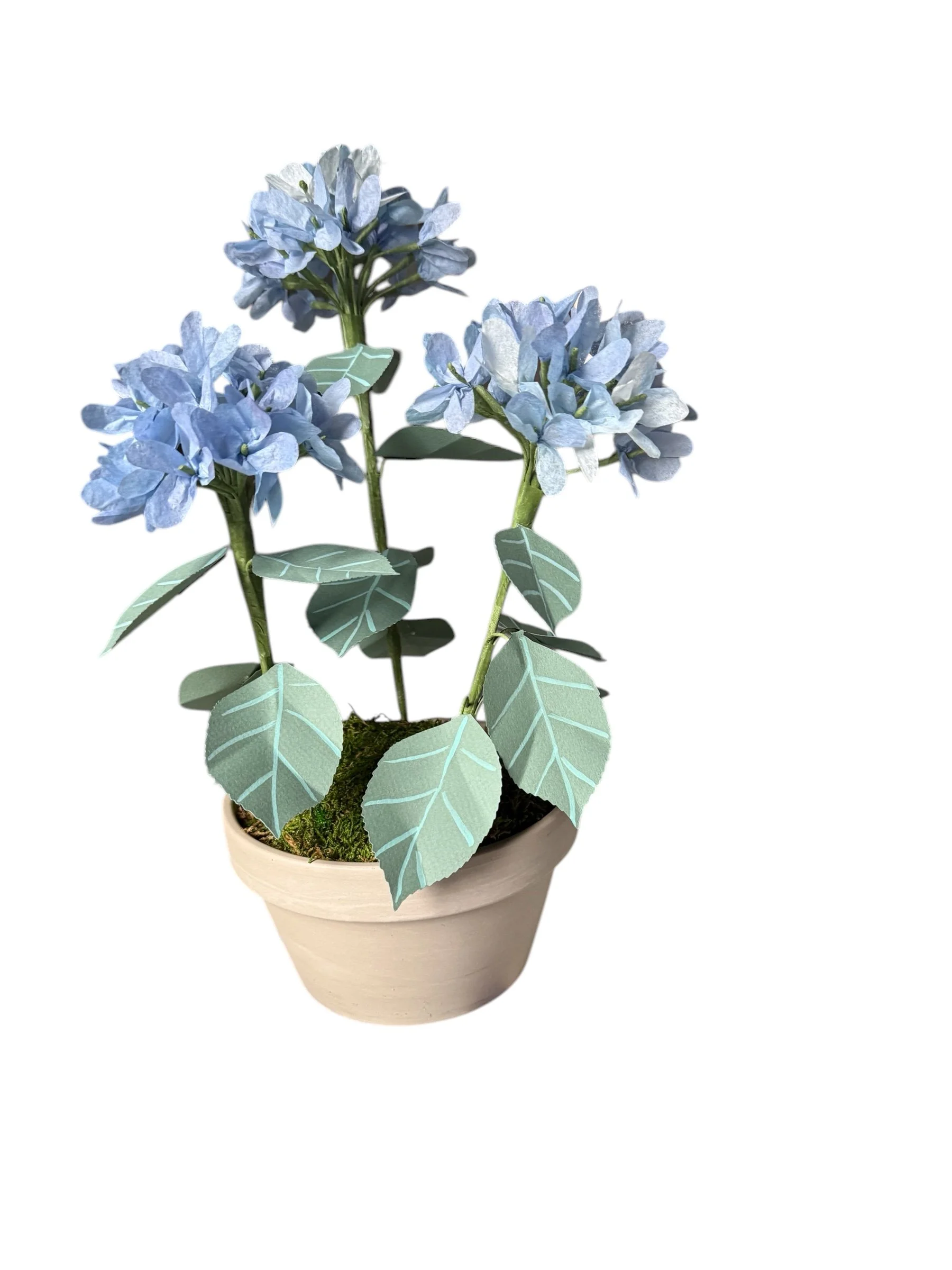 This classic blue hydrangea is the epitome of New England summer style. Three big, round blooms crafted from hand bleached tissue paper, painted leaves, and set in a pot with preserved moss. Each hydrangea is made to order and the “sun faded petals” are different on each bloom.