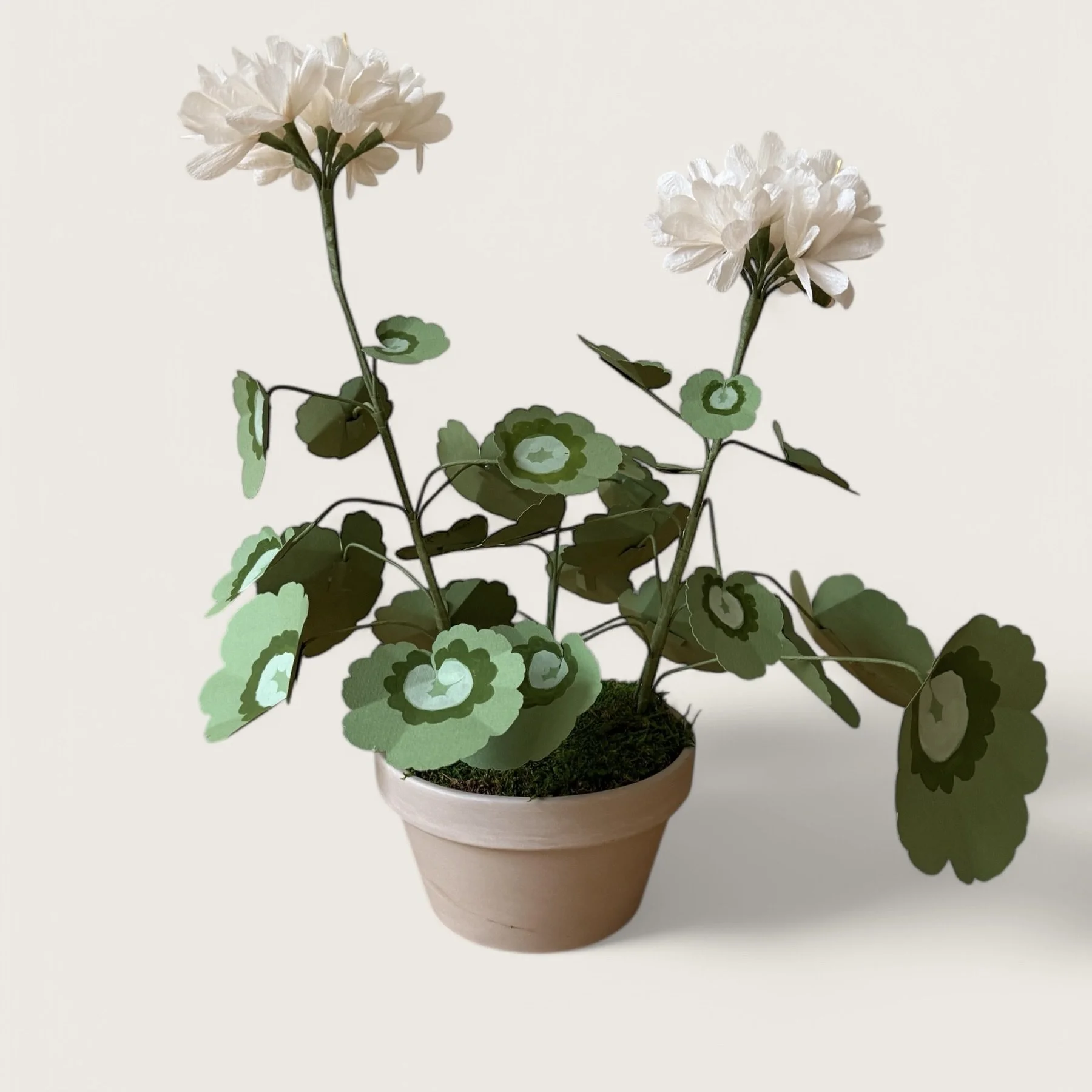 A showcase piece, handcrafted from paper and planted in a pot with preserved moss, the Large Geranium has two full blooms and multiple layer of variegated leaves and buds. Each Large Geranium is made to order and crafted from hand-dyed tissue paper and hand cut paper leaves that are painted with gouache. No two are alike!